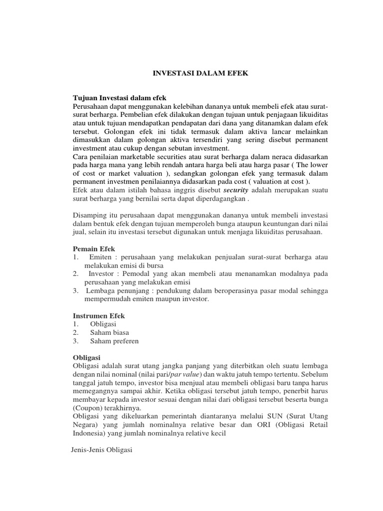 Pembelian efek dilakukan dengan tujuan untuk penjagaan likuiditas atau untuk tujuan mendapatkan pendapatan dari dana yang ditanamkan dalam efek tersebut. Tujuan investasi dalam efek perusahaan dapat menggunakan kelebihan dananya untuk membeli efek atau suratsurat berharga. Data harian emiten saham bursa efek indonesia, 15 februari 2021, halaman 1