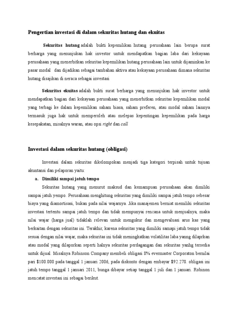 Pengertian Investasi Di Dalam Sekuritas Hutang Dan Ekuitas