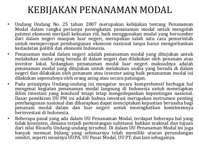 Menteri keuangan sri mulyani indrawati yang juga hadir dalam pertemuan itu pun menjabarkan bagaimana upaya pemerintah untuk terus menjaga iklim investasi di indonesia. Kebijakan investasi harus tepat kamis, 25 juni 2020. Arah kebijakan ekonomi indonesia dalam perdagangan dan investasi riil tulus tambunan pusat studi industri dan ukm, universitas trisakti i.