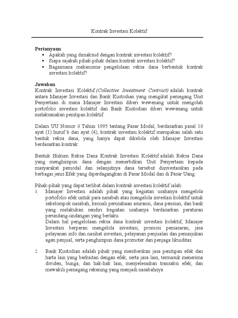 Kontrak investasi kolektif. Iv.b.1 pedoman pengelolaan reksa dana berbentuk kontrak investasi kolektif [pdf]iv.b.2 pedoman kontrak reksa dana berbentuk kontrak investasi kolektif [pdf]iv.b.3 reksa dana berbentuk kontrak investas. Ini efek positif omnibus law terhadap investasi reksa dana. Kepada pembimbing yang terhormat bapak budiharto, s.h., m.s.,