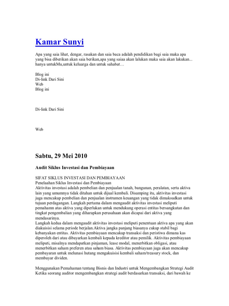 Siklus pendanaan berkaitan dengan aktivitas penghimpunan dana yang berasal dari pihak lain, baik sebagai setoran modal maupu utang jangka panjang, pembayaran kembali utang jangka panjang, pembayaran bunga dan deviden. Lakukan review terhadap mutasi luar biasa dalam jumlah dan sumber posting dalam akun. Audit siklus investasi instrumen keuangan (obligasi dan saham) terimakasih * halaman halaman siklus investasi instrumen keuangan siklus investasi instrumen keuangan adalah siklus investasi yang berhubungan dengan transaksi investasi pada instrumen keuangan.